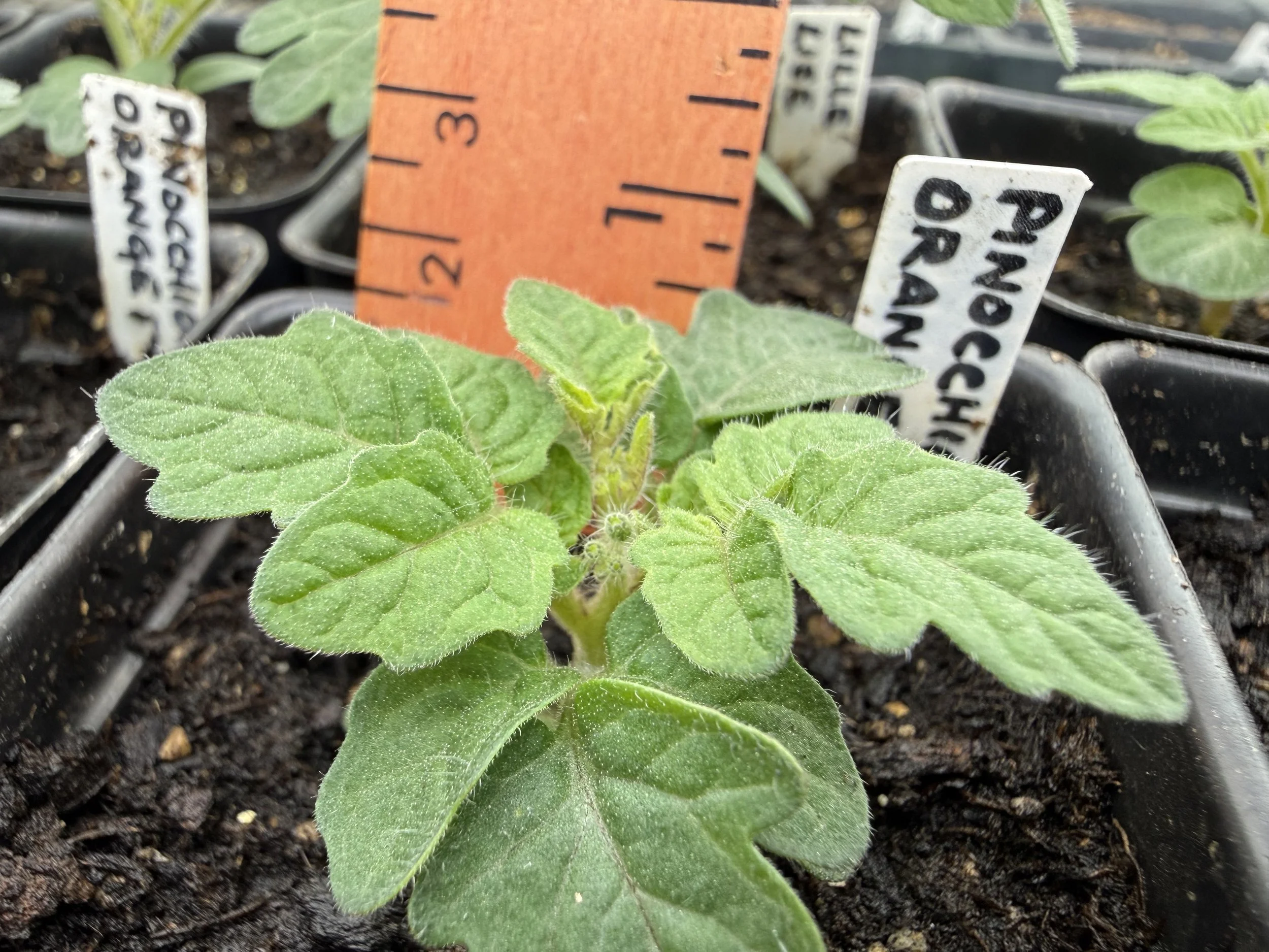 I have 8 each micro dwarf tomatoes growing and looking beautiful. When I was taking a photo of one, I noticed that it appears to have flower buds already forming! This particular variety (‘Pinocchio Orange’) was planted on 14 January and is only one inch tall. It’s the first time I’ve grown this variety. Its mature height will be 7 to 10 inches. The micro dwarfs are sitting on a heat mat to provide the warm “weather” they prefer.