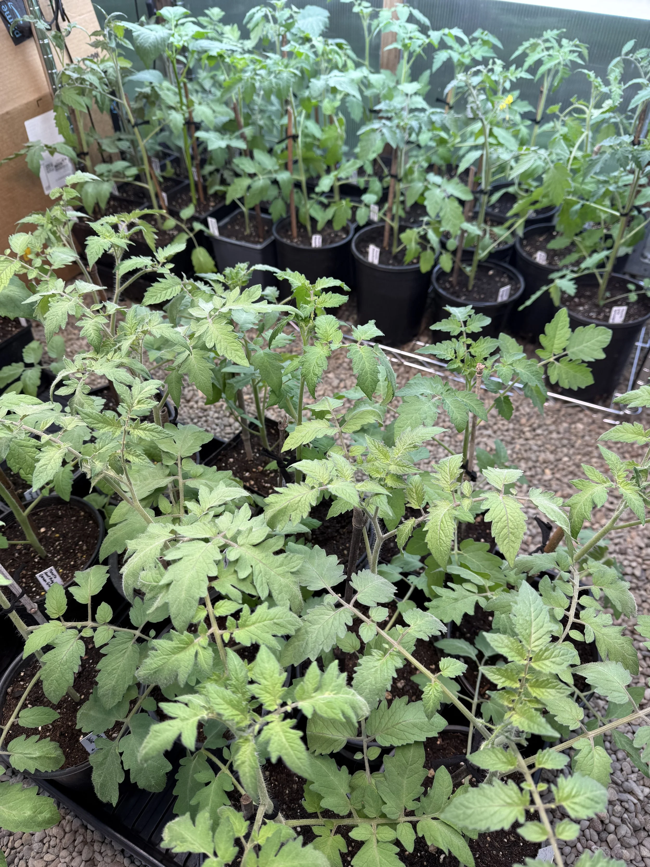 The tomatoes in the greenhouse have been outgrowing my shelf and light space. I have had to install lights hanging from the rafters over the aisle area and now have tomato plants sitting on the gravel floor in a big group. I have to walk sideways to work in there now. In all the years I have been growing tomato plants, I have never before had to up pot so many from 4 inches above to gallon size.