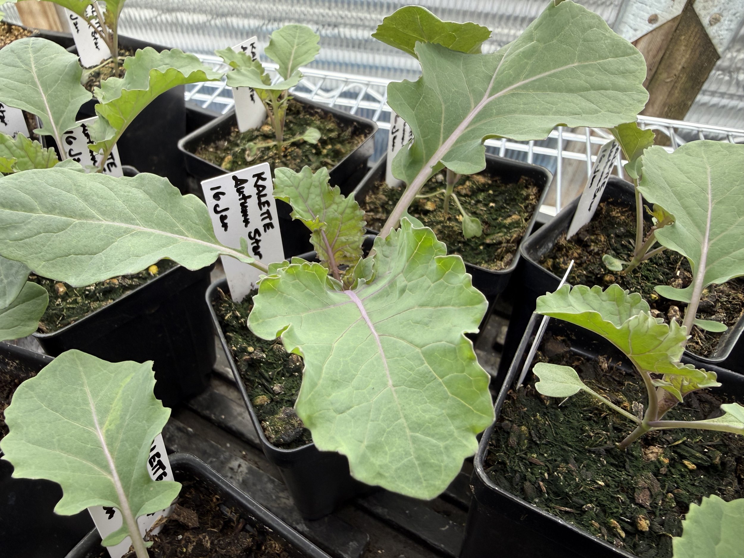 Kalettes are growing well in the greenhouse. The smaller plants are catching up in size with the larger ones, but they are not quite ready to leave home yet.