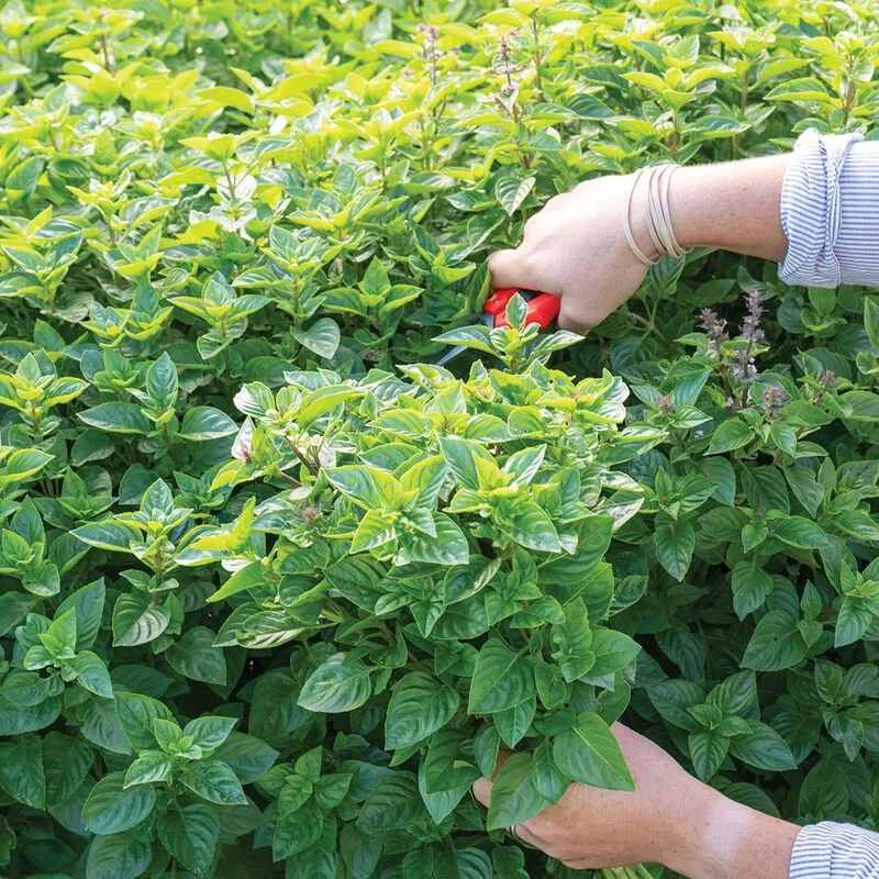 Basil loves hot weather and plenty of sunshine, but it needs consistently moist, rich soil. Mulch the plants to retain moisture, and water heavily during dry spells. Harvest the plant before the cold weather sets in, as this will affect the leaves' texture and flavor. Freeze entire stems, with the leaves still attached, for best flavor retention, or dry the leaves for seasoning. F1 hybrid variety. (Park Seed)