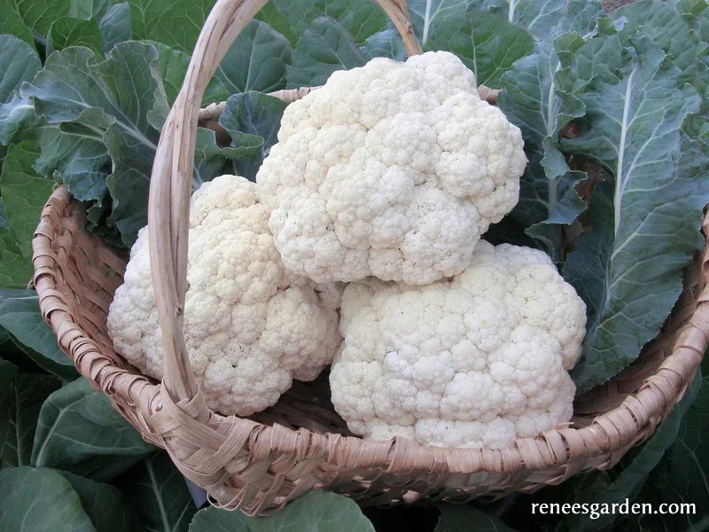 This outstanding variety yields dense, 6 to 7 inch, dome-shaped heads with tender, creamy-white curds and superb mild, nutty-sweet flavor. These top quality hybrid plants grow quickly, producing strong outer wrapper leaves that protect both the quality and color of the developing cauliflowers for harvestable heads extra early in the season. The heads are delicious whether cut up raw in salads, quickly steamed, or tossed with olive oil and roasted to nutty perfection. F1 hybrid variety. (Renee’s Garden)