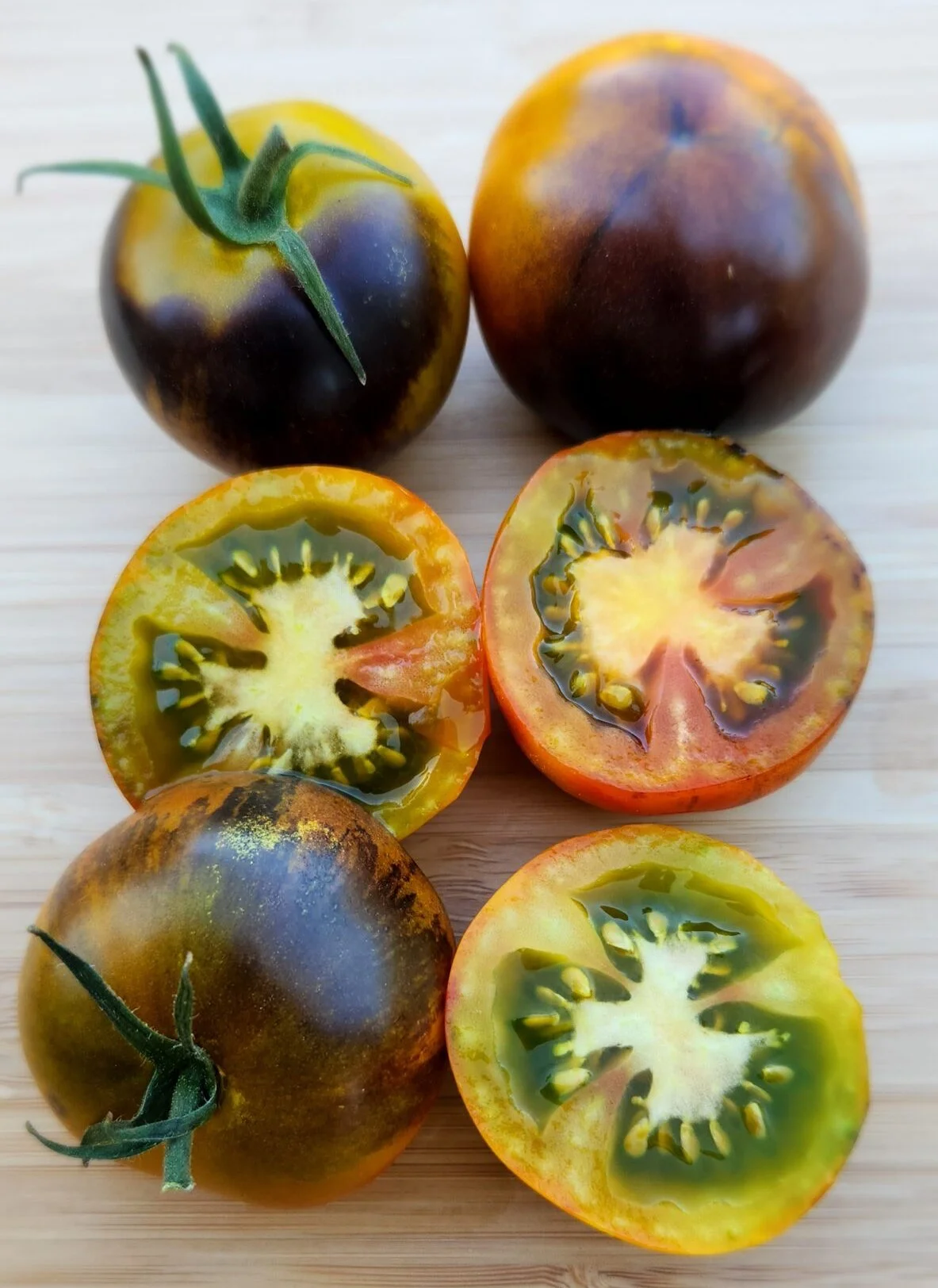 (75 days) A pretty antho variety, Primary Colors tomatoes are large cherries with dark top antho pigmentation and canary yellow blossom ends. A milder fruit hints of sweets and fruitiness, this can make the perfect tomato for someone not wanting a too strong tasting variety. Our 4.5 feet tall plants were very productive but late ripening. These would be perfect for garnish, drying/dehydrating, cooking, snacking and more. Try these in larger containers, they should also do well. Must be staked well.