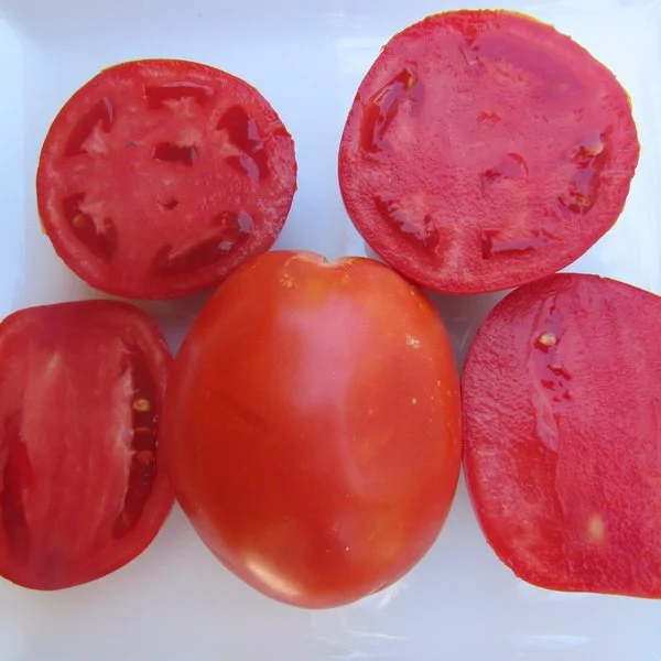4-6 oz. fruit, Red paste tomato. Very meaty, almost no seeds – Outstanding production from a short stout semi-indeterminate plant.Very good true tomato flavor. Can be eaten fresh or processed. Excellent container plant. (Wild Boar Farms)